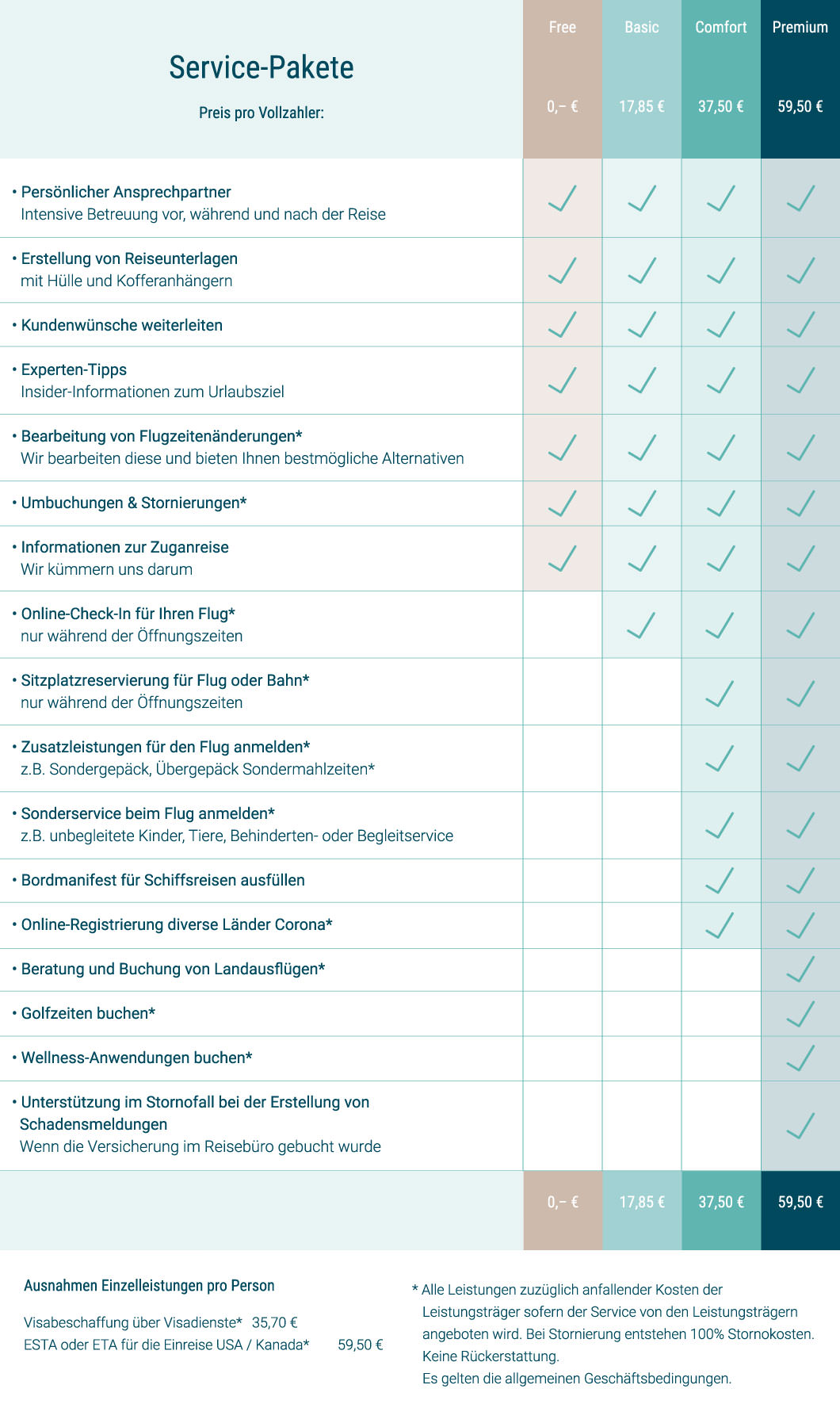 Wieviel Service benötigen Sie rund um Ihre Reise? Bei uns haben Sie die Wahl das für Sie passende Service-Paket auszuwählen. Bei Interesse nehmen Sie gern Kontakt zu uns auf.
